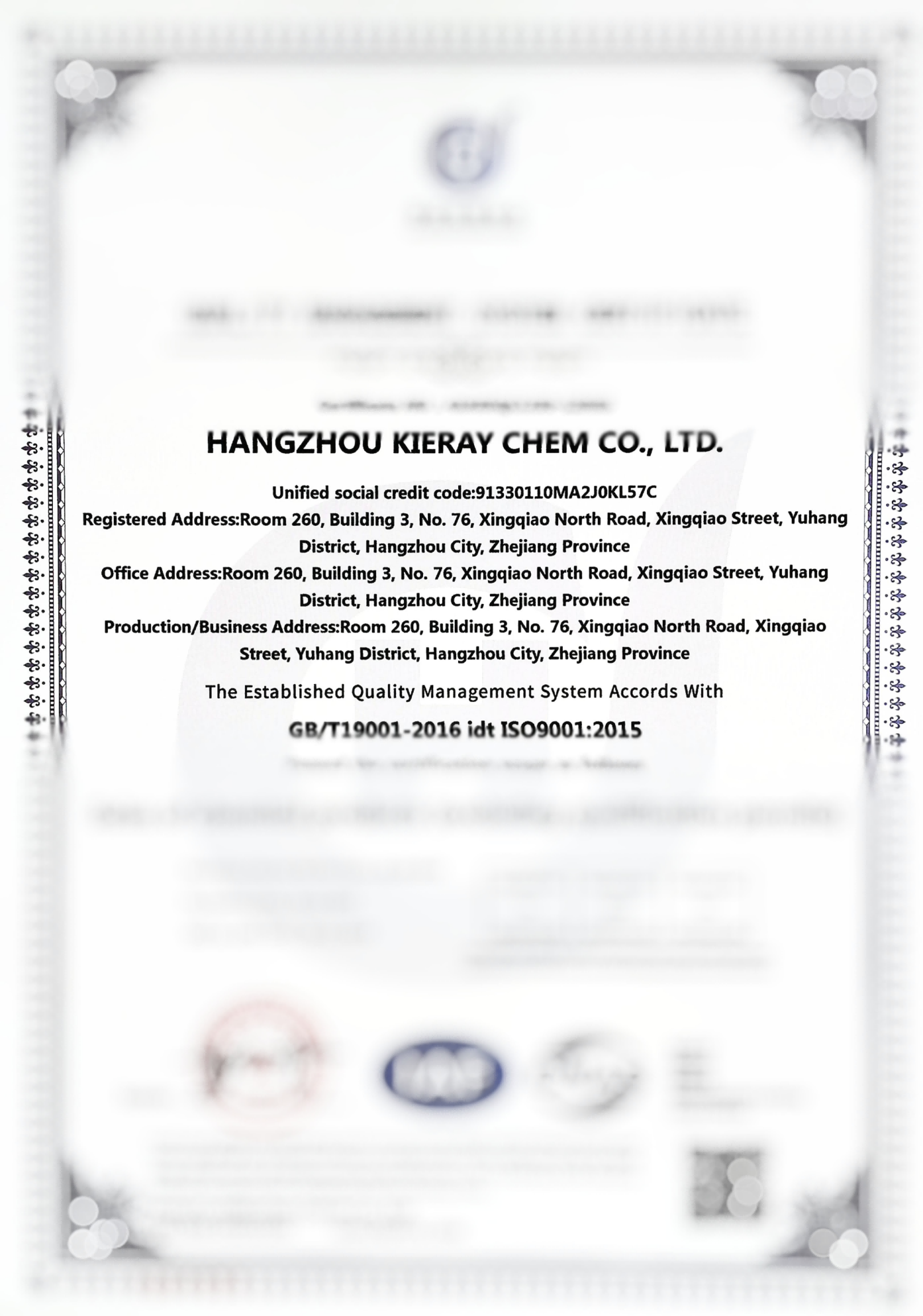 Hangzhou KieRay Chem Co., Ltd. has passed the ISO9001 International Quality Management System Certification!